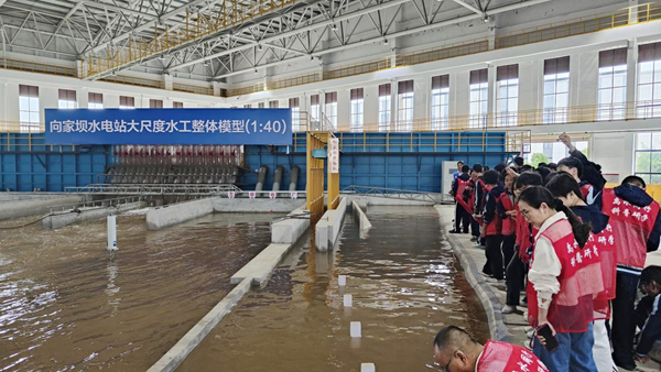 在通航枢纽综合试验厅,基地科普讲解员蔡凯介绍了三峡水运新通道、平陆运河等国家重大工程建设背景和基本情况,水工水力学研究所孙靖康博士用具体的数字和通俗易懂的语言介绍了向家坝水电站大尺度水工整体模型试验情况以及向家坝水电站在我国发电、航运和灌溉等方面的重要作用,揭示了水工物理模型试验研究的目的和意义,让学生们了解了向家坝水电站的工作方式和当下需要攻克的技术难题,激发了学生们积极探索创新的兴趣。