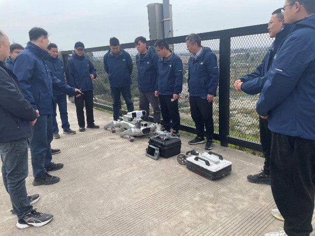 在安全隐患排查工作中,南自所带来了在应急部揭榜攻关项目“堤防险情隐患快速巡查空中成套技术装备”研发中初步落地的成套装备,运用“无人机 机器狗 探地雷达”综合手段,在水利部“现代化水库运行管理矩阵”试点水库——成都市天府新区塔寺沟水库,首次对大坝进行了“空-地-内”一体的全面智能“体检”。在巡检中,智能巡查机器狗搭载多光谱传感器,实时捕捉裂缝、渗漏等表面缺陷,同时,配合无人机厘米级精度三维扫描建模与探地雷达探测地下坝体内情况,突破传统“眼看、耳听、手摸”的巡检局限,高效、精准、完整地完成全坝、全域、深入坝内的检测,尤其在复杂地形和恶劣环境下具有不可替代的优势。“无人机 机器狗 探地雷达”的智能三件套,以新质生产力有效提升水库安全运行,系统解决了“看不见、摸不着”的结构性隐患,为行业树立了技防新标杆,得到了成都市水务局和天府新区水域中心领导的高度认可。成都市水务局领导表示将把此项新技术结合实际广泛用于汛期前中后全生命周期,对水库定期“体检”。