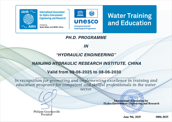 近日,水利部 交通运输部 国家能源局南京水利科学研究院申报的水利工程博士课程正式获得国际水利与环境工程学会(iahr)与联合国教科文组织政府间水文计划(unesco-ihp)联合认证的水教育标签,成为我国首个、全球第六个获得国际涉水学术组织认可的水教育课程。