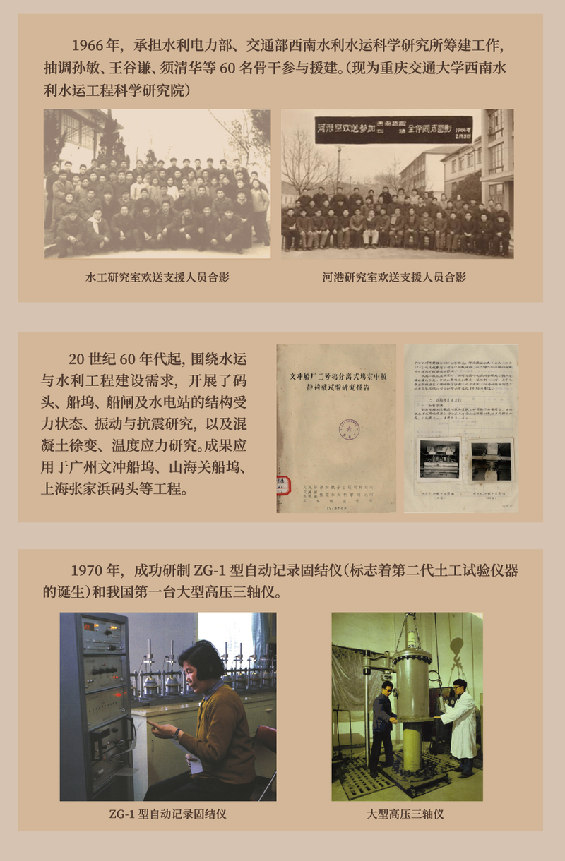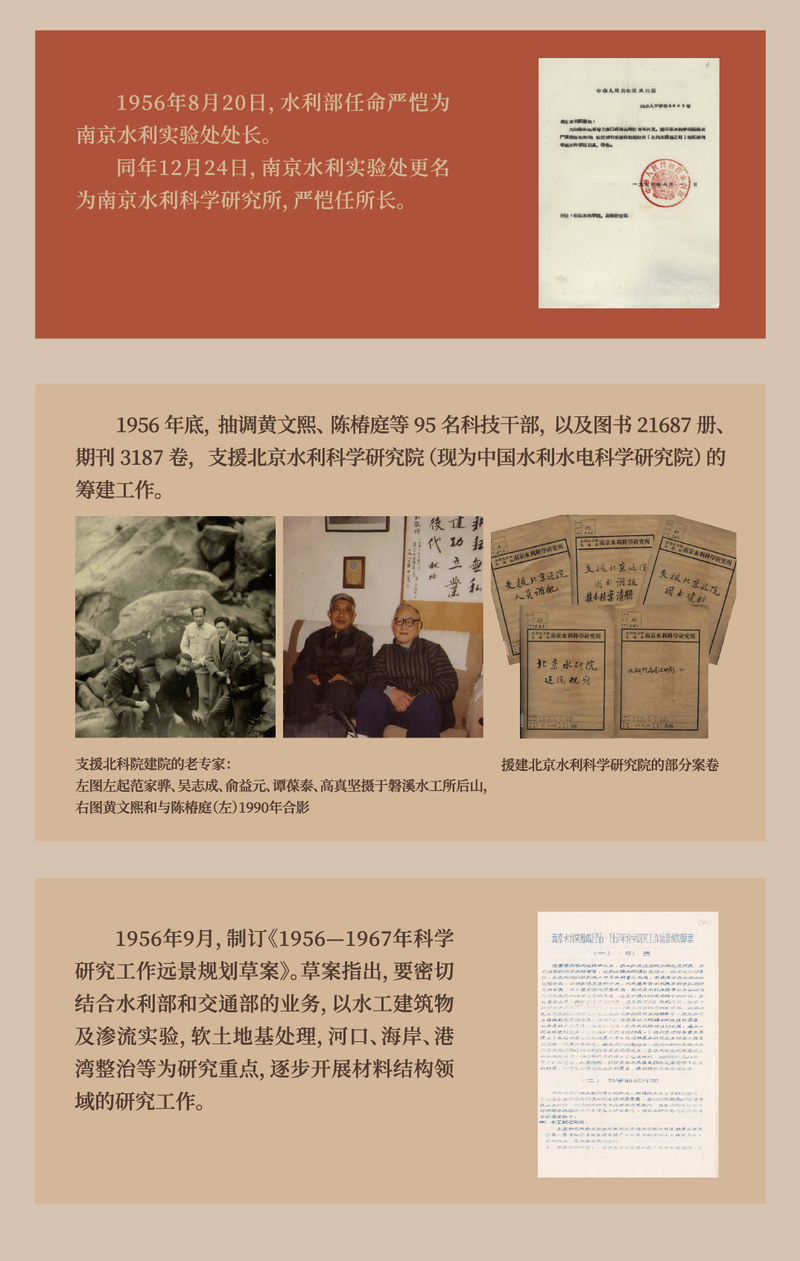 新中国成立后,南京水利实验处(南京水利科学研究所)开办多期水文技术、水工试验、土工试验等培训班,为国家培养了数千名技术骨干;抽调大批人员参与创建西北水利科学研究所、国电南京自动化股份有限公司、中国水利水电科学研究院、浙江省水利河口研究院、西南水运工程科学研究所、天津水运工程科学研究院等科研机构,被誉为中国水利水运科技人才的摇篮。坚持理论结合实践,承担大量重大科研任务,有力支撑了国家基础设施建设,为我国水利、交通及能源科研体系的建立与发展奠定了坚实基础。